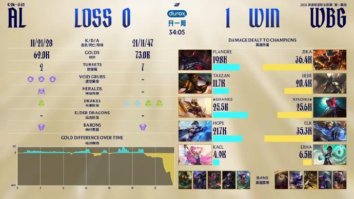 第一波碰撞发生在巢虫团,AL打出2换3拿到一点点优势,但Xiaohu乌鸦吃到两颗人头发育不错。随后Jiejie下路反蹲击杀鳄鱼并顺势控下小龙,WBG的后期阵容有了拖下去的资本。Elk接下来在中路发难,杀掉守中一塔的Kael。WBG控下龙魂后又拿下大龙,直接在AL高地游龙后结束比赛,拿到三个赛点!