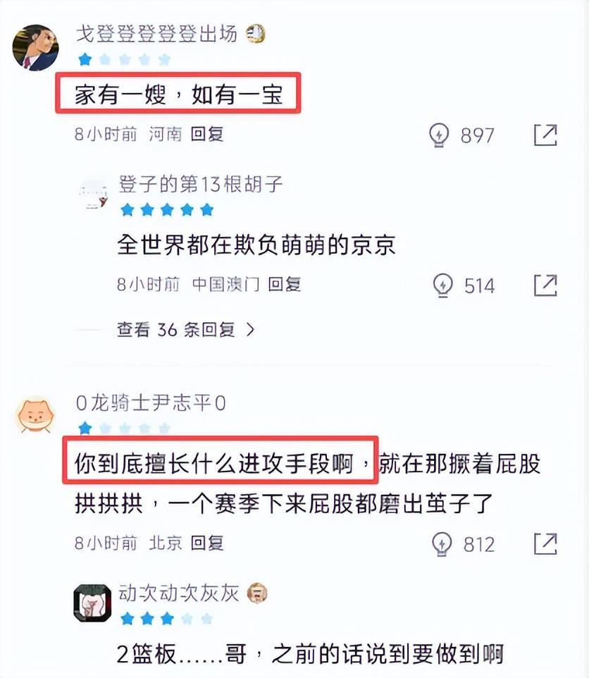 赛后,某篮球论坛上,球迷忍不住纷纷吐槽:“家有一嫂,如有一宝”、“你到底擅长什么进攻手段啊,就在那撅着屁股拱拱拱,一个赛季下来屁股都磨出茧子了”、“这就是全明星?”.....