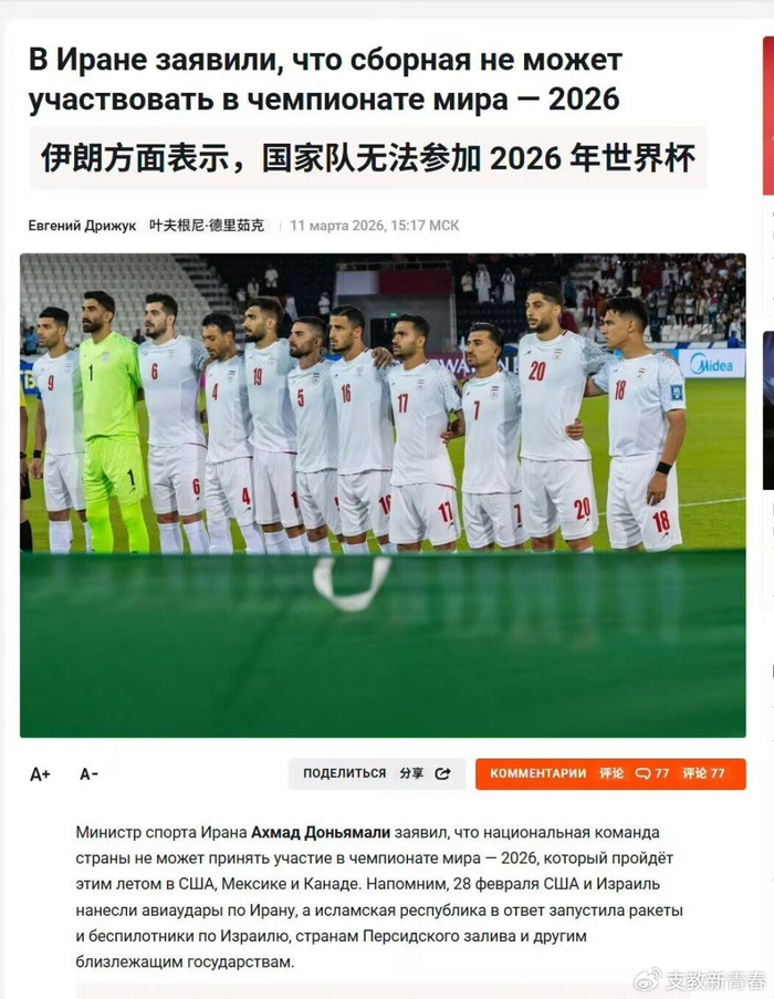 3月11日,伊朗体育部部长杜尼亚马利在接受媒体采访时表示:介于局势问题,伊朗男足将退出2026年美加墨世界杯。