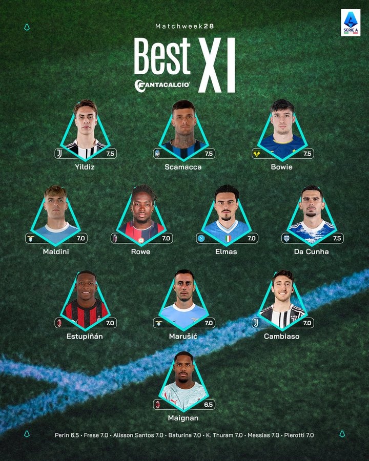 3月11日讯 意甲第28轮战罢,联赛官方列出本轮最佳阵容,迈尼昂、伊尔迪兹、斯卡马卡在列。
